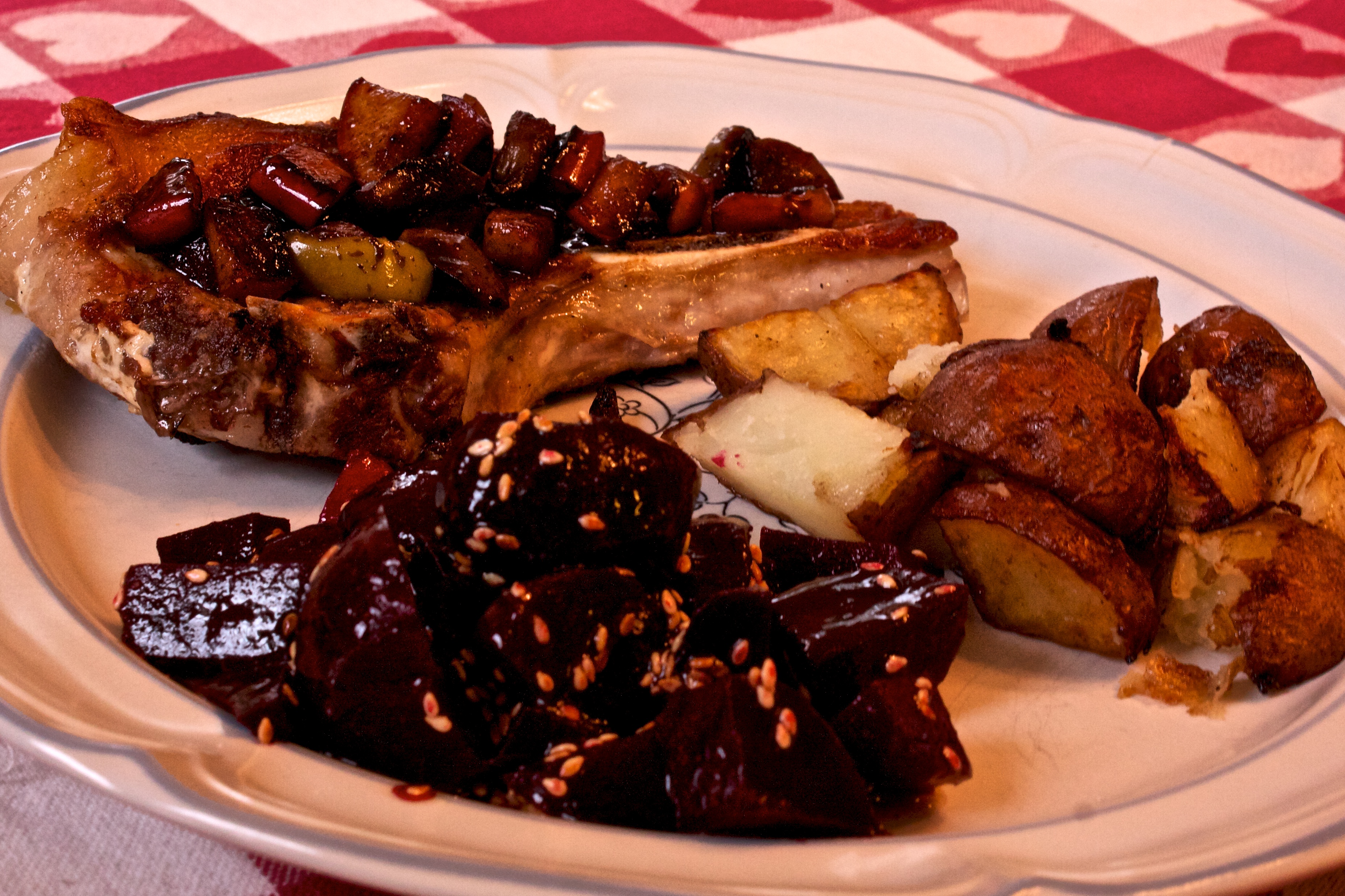 I used the beets and potatoes for supper that night. I thawed a couple of Berkshire pork chops and had those with an apple chutney, roasted potatoes and a beet salad.