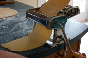 If you are going to make pasta it is best to have a pasta machine but it is not required. A pasta machine will allow you to get a nice thin noodle with a consistent thickness. If you are good with a rolling pin, flour your counter, and roll the noodle to about 1/8 of an inch thick. Flour the top of the dough lightly then roll it up like you would a jelly roll. Using a very sharp knife slice off the pasta into the widths you desire. You can also use the pasta as lasagna sheets or as the top and bottom or raviolis. I will be posting lasagna and stuffed pasta recipes in the near future.