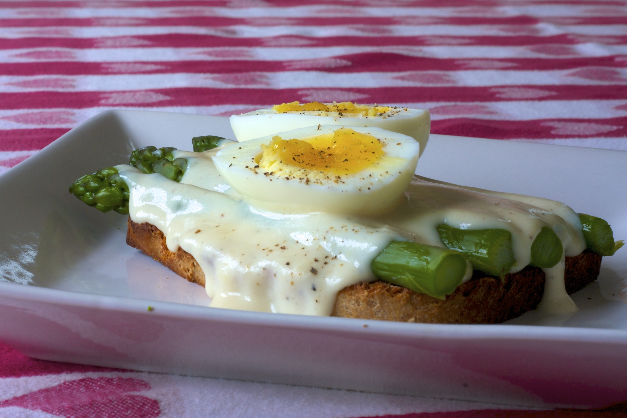 Bring a large pot of water to a rolling boil. Trim the lower 1/2 inch of asparagus off. Allow 4 to 5 spears per person. Salt the water with 1 tbsp of salt and then drop in the asparagus for 3 minutes. Allow to dry for a couple minutes on a clean tea towel and then place on the toast, top with the béchamel and a boiled egg cut in half. Season with a pinch of sea salt and fresh ground pepper.