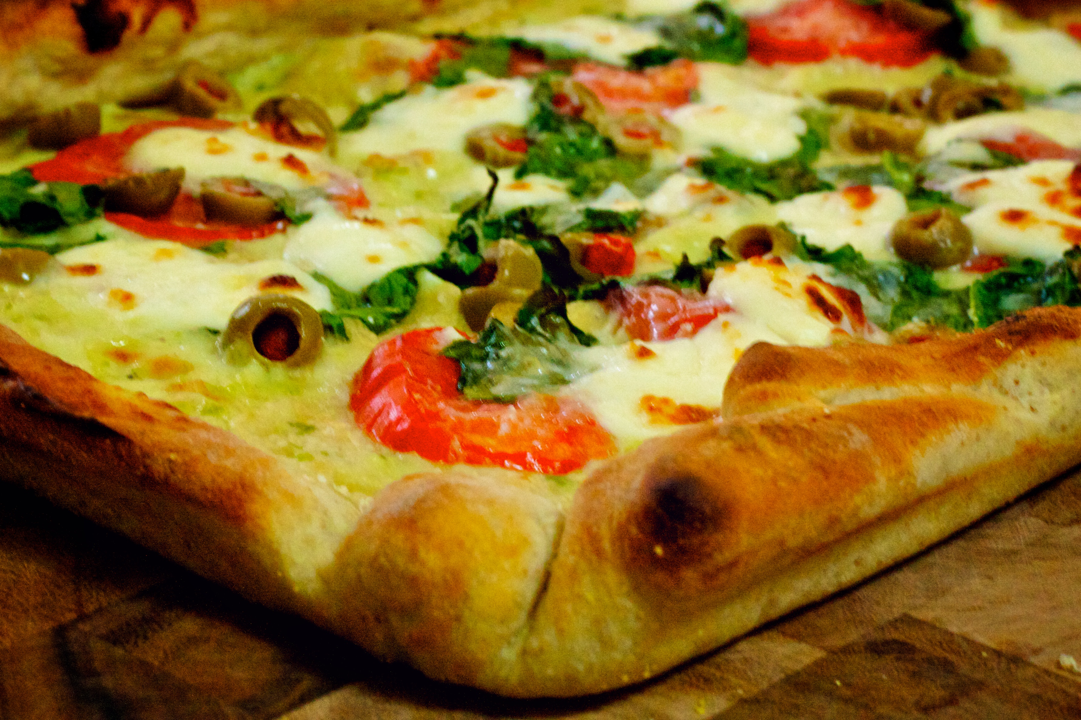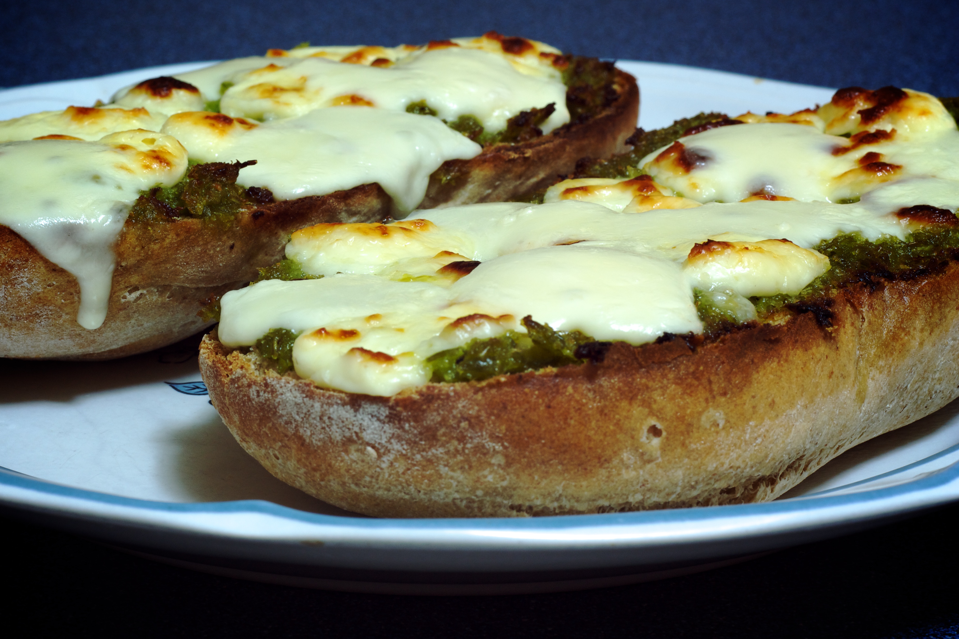 Heat up your broiler to 500 degrees, top the bread with the meat sauce and a generous amount of fresh cheese curds. Broil until the cheese is bubbly and starts to brown, top with a little more pesto and serve.
