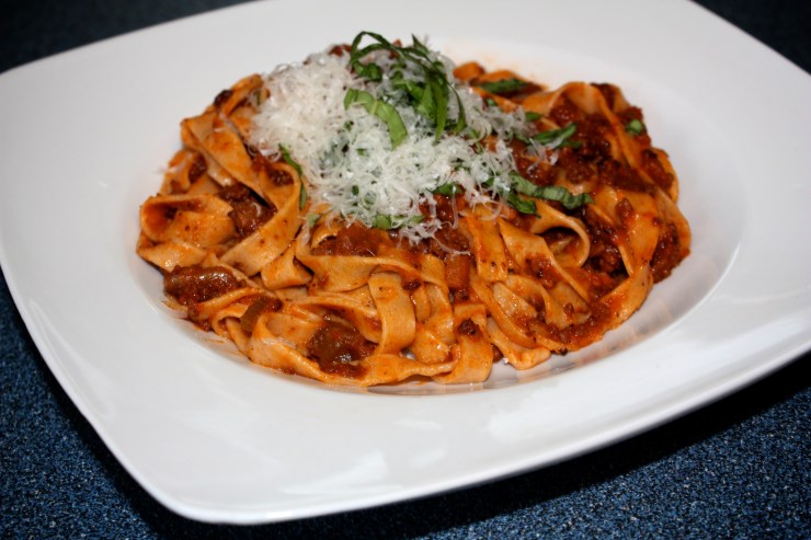 When everything is well browned add the tomato paste, and paprika and cook until you see the oils separate, tomato paste is always better when you fry it off a bit. Now we go after the brown bits on the pan which are full of flavor. Deglaze the pan with the bourbon and worcestershire sauce. Then add in the beef, stir well to combine and add in the milk and nutmeg and finally the tomato sauce. Now reduce the heat to low and maintain a low simmer. Cover and let simmer for a good 2 to 3 hours. Stir every half hour or so adding in a little water if it starts to get too thick. This will make the meat super tender and the flavors will meld beautifully. When it has finished simmering add salt and pepper to taste.